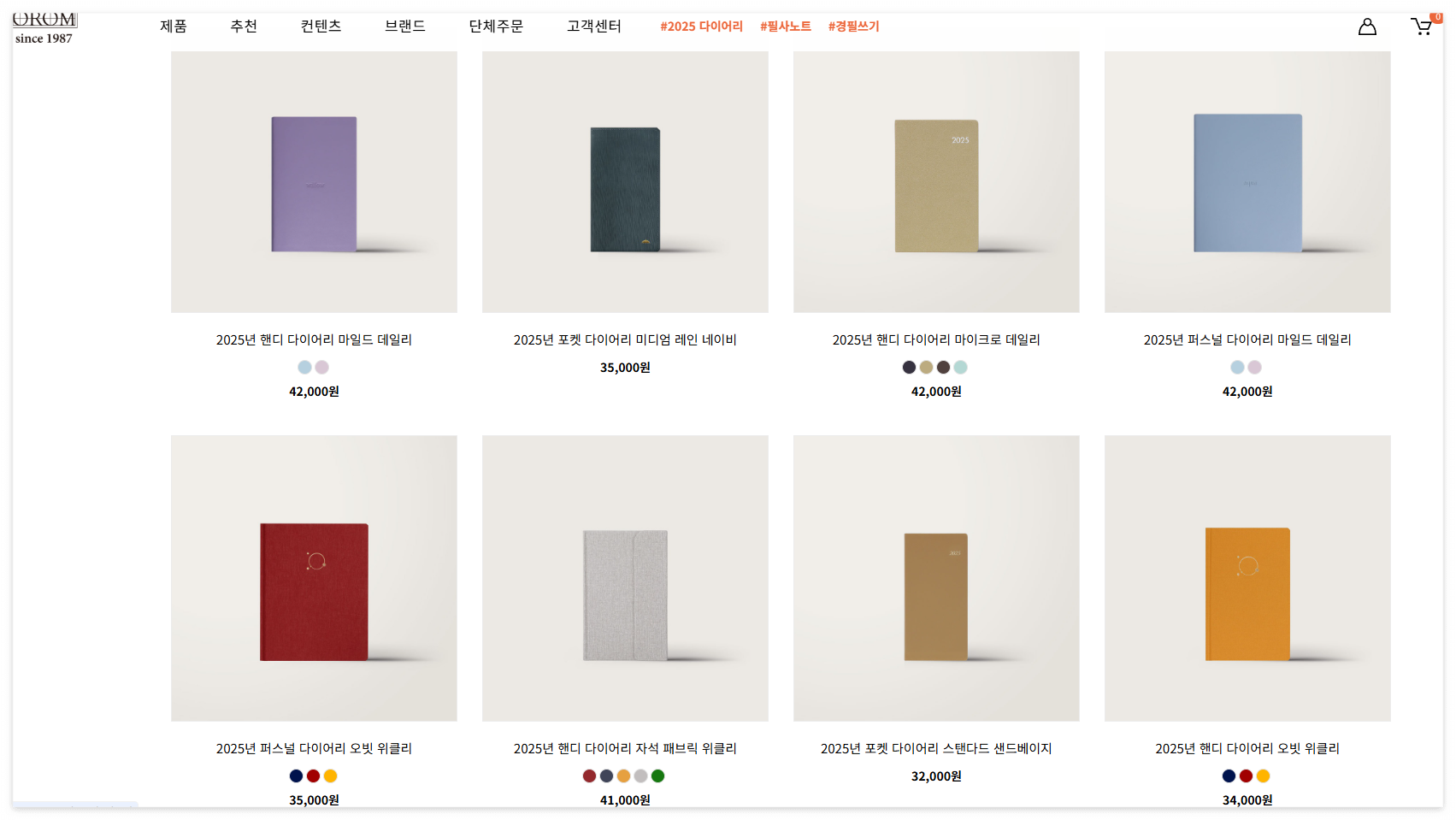 • 다양한 디자인과 사이즈: 오롬 다이어리는 사용자의 취향과 용도에 맞춰 다양한 디자인과 사이즈를 제공합니다. 예를 들어, '2025년 핸디 다이어리 마일드 데일리'는 업무용 및 일상 다이어리에 최적화된 사이즈로, 자연에서 영감을 받은 컬러와 부드러운 촉감의 커버가 특징입니다.
