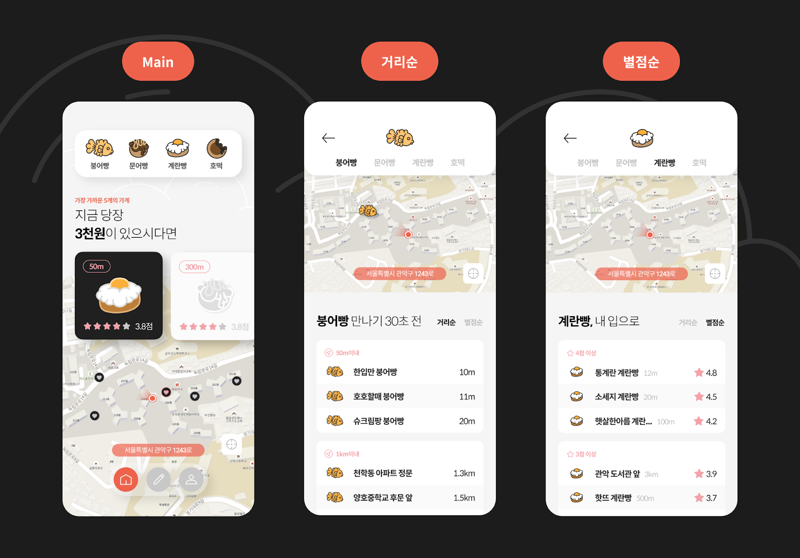 - 붕어빵 카테고리 선택: '붕어빵' 카테고리를 선택하면 주변 붕어빵 판매처가 지도에 표시됩니다.