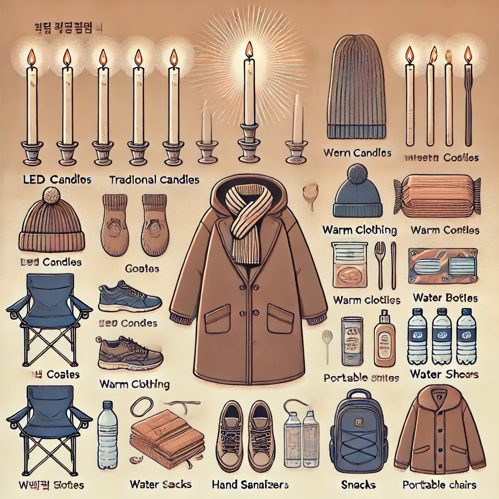 촛불집회에 참여할 때는 다음과 같은 준비물을 챙기시면 좋습니다.