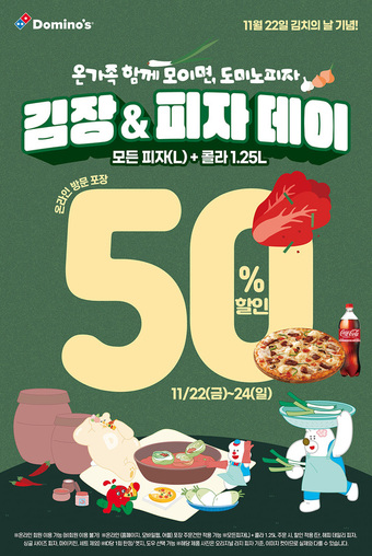 11월 22일은 '김치의 날'로, 우리나라의 대표적인 전통 음식인 김치의 가치를 기념하는 날입니다. 이 특별한 날을 맞아 도미노피자는 '김장 & 피자데이'라는 이색적인 프로모션을 진행합니다. 22일에서 24일까지 모든 제품에 대해 50% 할인행사를 진행합니다. 할인 혜택 놓치지 마세요~!