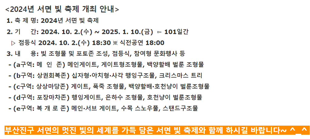 [1] Visit Busan - 서면 빛 축제 | 축제·행사 | 유용한정보 (https://www.visitbusan.net/schedule/view.do?boardId=BBS_0000009&menuCd=DOM_000000204012000000&dataSid=2844)