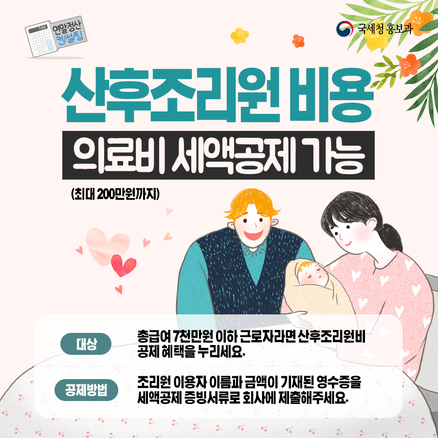 절세 방법: 산후조리원 이용 시 발생한 비용을 의료비 세액공제로 최대 200만 원까지 공제받을 수 있으니, 해당 비용을 정확히 계산하여 연말정산 시 반영하세요.