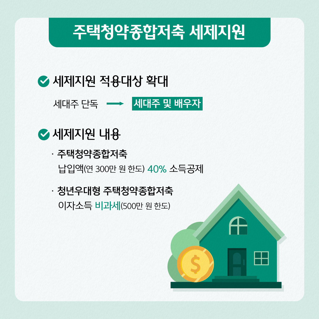 절세 방법: 주택청약종합저축 납입 한도가 상향되었으니, 한도 내에서 최대한 납입하여 소득공제를 받으세요.